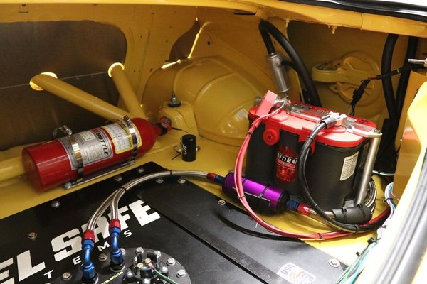 22 gallon Fuel Safe Sportsman fuel cell, roof-mount radio antenna and wiring kit, fire bottle (expired) from Pegasus, extra painted trunk lid, extra stock K-member, (12) 17x9 Bullit solid gloss black wheels.
